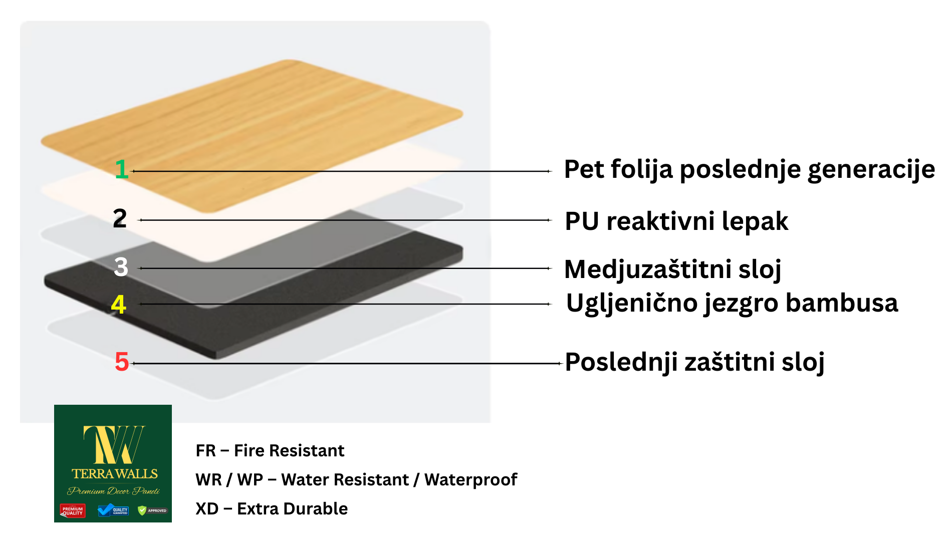 Na površini se nalazi PET dekor folija koji obezbeđuje dugotrajnu boju, UV zaštitu i maksimalnu otpornost na ogrebotine. Bambus paneli unose toplinu, strukturu i prirodan luksuz u svaki prostor, bilo da se koriste u dnevnoj sobi, kancelariji, hotelu, restoranu ili poslovnom objektu.